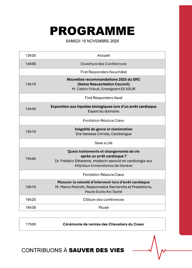 A la suite des conférences, et afin de vous remercier pour votre engagement permanent, nous vous invitons à la remise des Chevaliers du Cœur. Vous pourrez y écouter un témoignage, partager vos expériences entre premiers répondants, échanger avec nos formatrices et formateurs et enfin prendre un apéritif dinatoire convivial pour clôturer cette 2e manifestation.